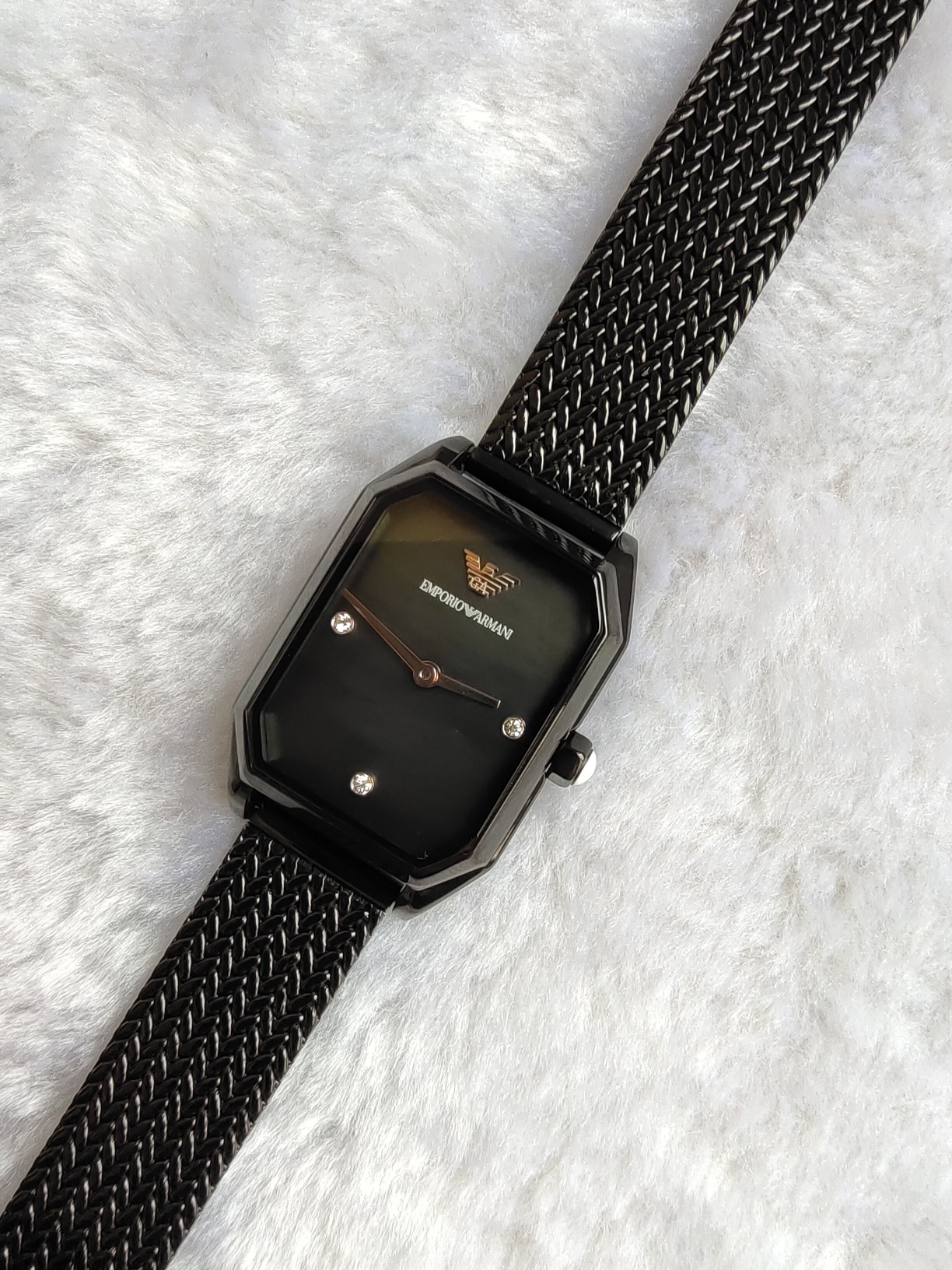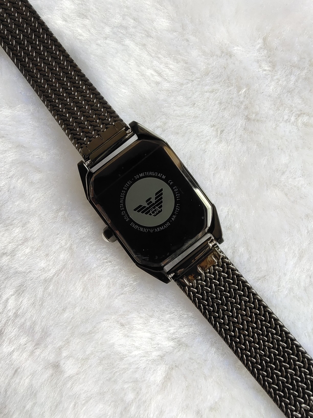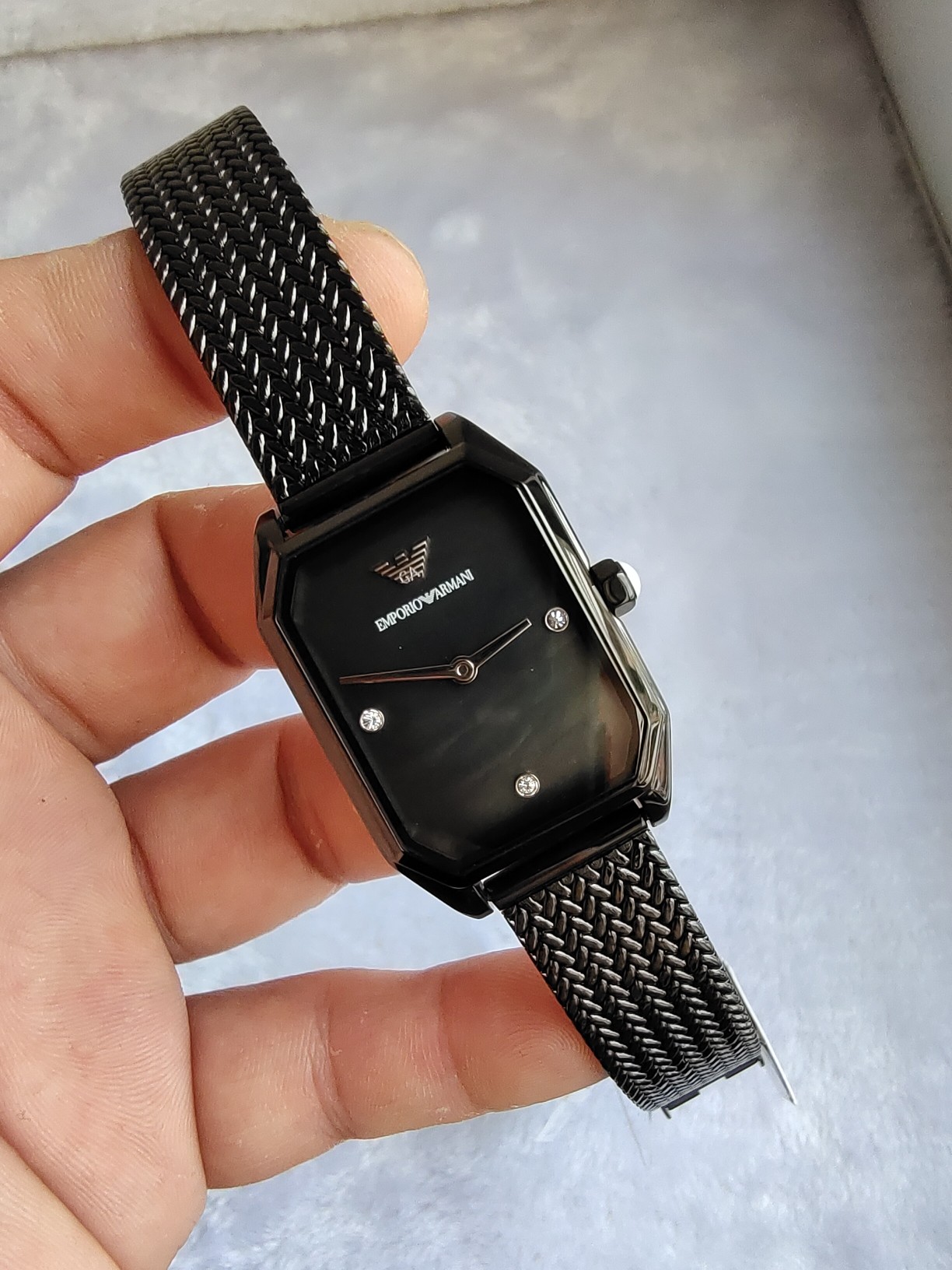 (Emporio Armani)阿玛尼女士手表, 方盘编织袋休闲石英女士腕表 。 利落流畅的表盘线条 ,不锈钢表圈, 闪耀气质光华, 精细抛光工艺打造 延续表身镜面质感 镌刻经典鹰形LOGO. 不锈钢针扣表带 搭配品质编织表带工艺 看得见的时尚舒适 表盘直径16.4mm 矿物质玻璃镜面 生活防水30mm搭配专柜全套包装;